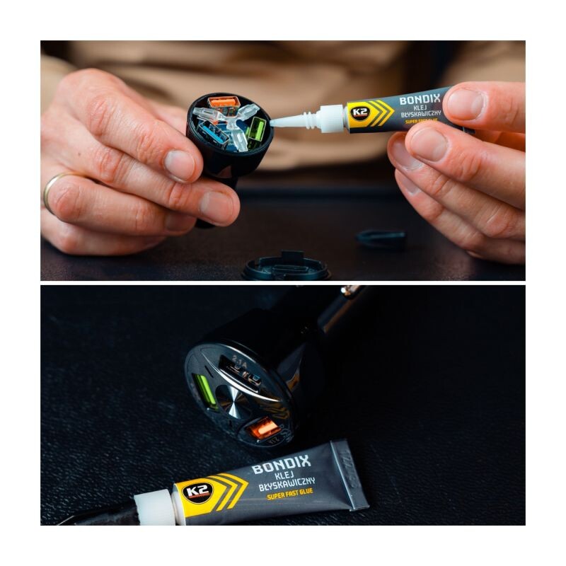 Super fast glue for plastic, wood, rubber, leather and ceramics. Gluing surfaces should be dry and clean.